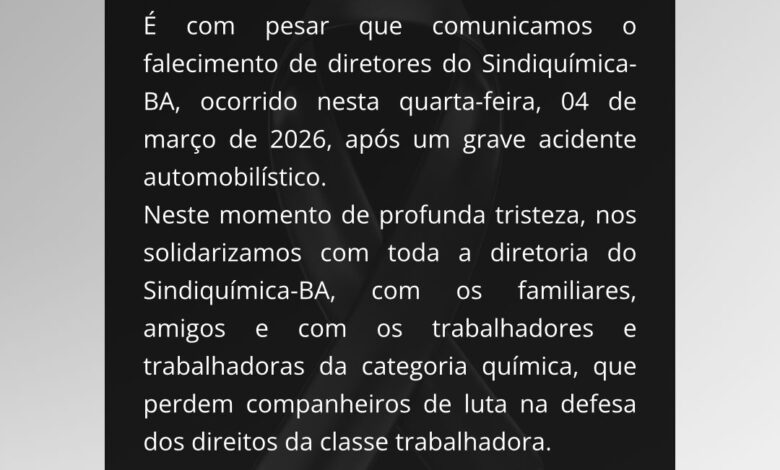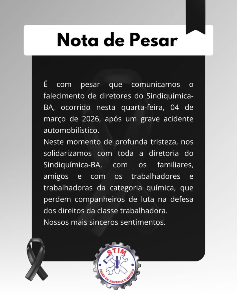 O Sindicato dos Trabalhadores nas Indústrias Metalúrgicas de Feira de Santana e Região (STIM) manifestou profundo pesar pelo falecimento de diretores do Sindiquímica-BA, ocorrido na quarta-feira (04), após um grave acidente automobilístico.